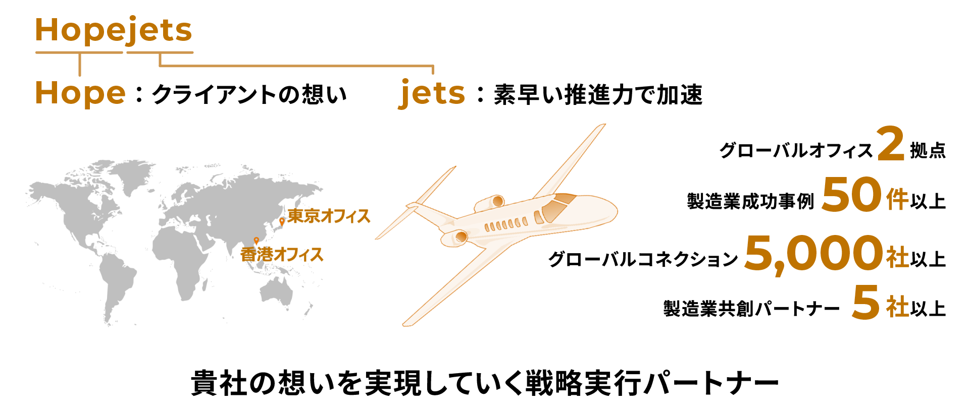 Hopejets Consultingは香港発のプロフェッショナルファームとして、観光やものづくり業界を中心に日本企業の海外進出、海外企業の日本市場参入に貢献いたします。Hope(クライアントの想い)+Jets(素早い推進力) という社名に込めた想いから、独自の「SalesWing」ソリューションによりクライアントの経営層の意思決定・グローバル成長のスピードを加速させて頂きます。 Read More